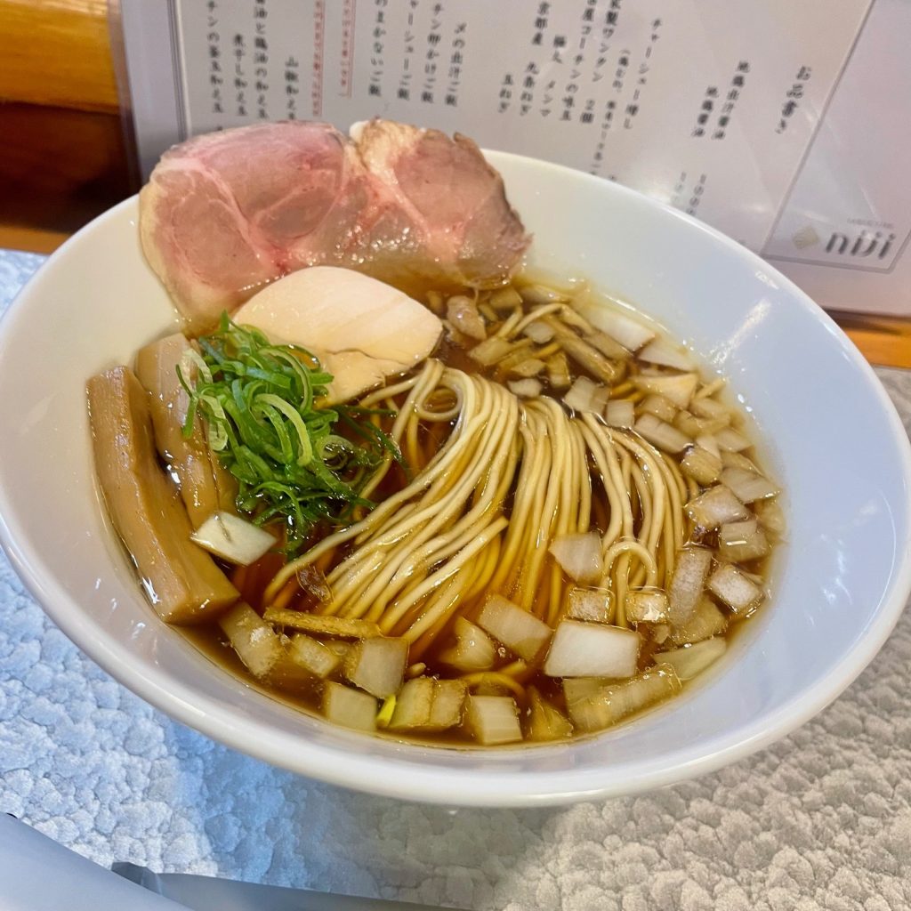 黒醤油と同じ名古屋コーチンと上州地鶏のスープに国産のカタクチイワシの煮干しと北海道産の利尻昆布と国産厚削りのかつお節を使用。えぐみが出ないように低温で上質な出汁を煮出しました。。